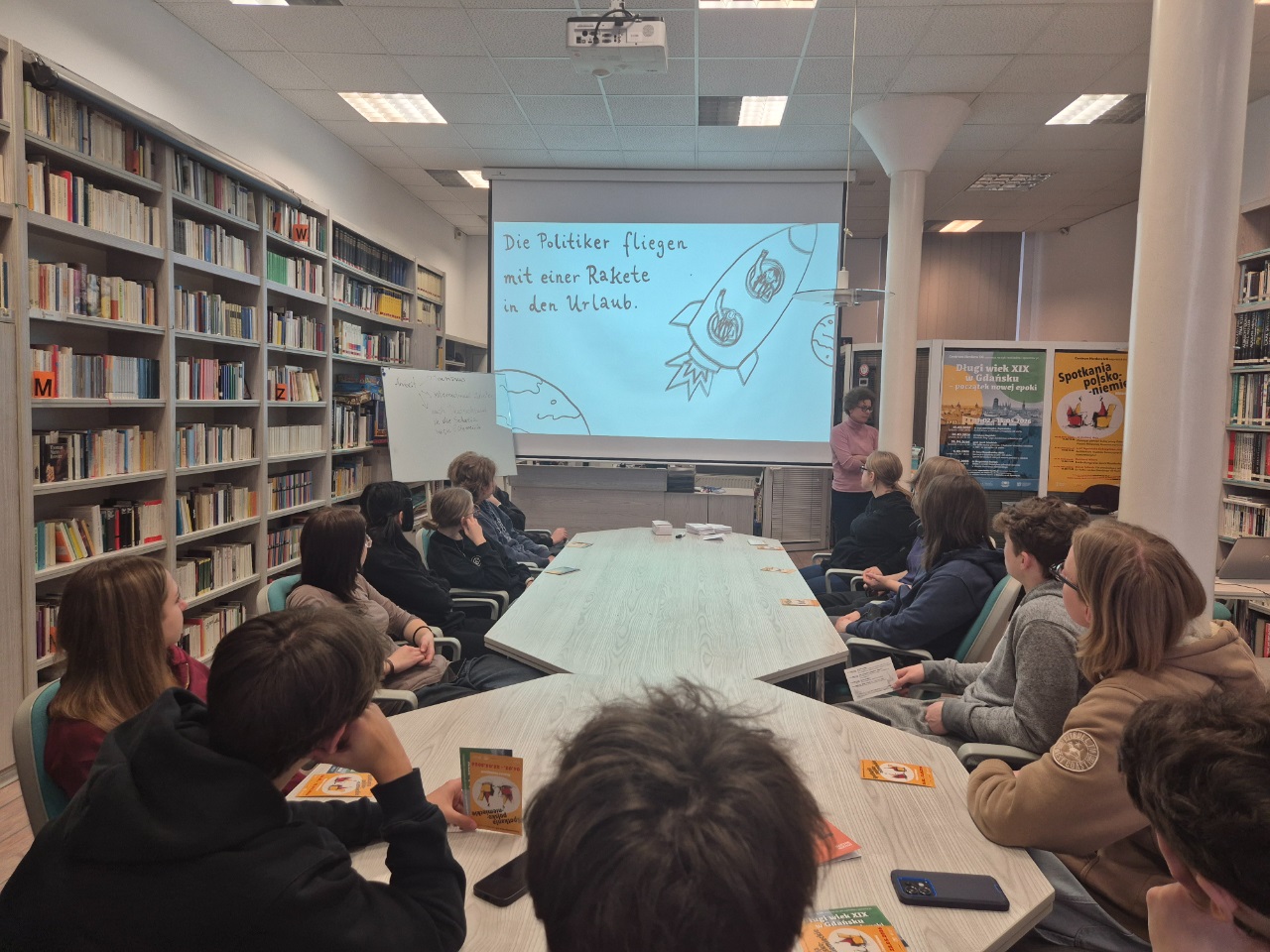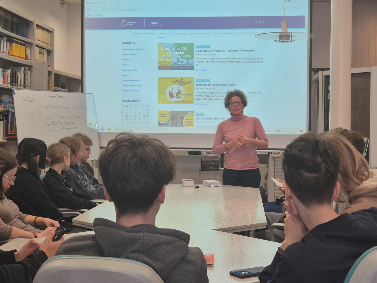 Dnia 31 marca 2026 r. uczniowie klas pierwszych wzięli udział spotkaniu edukacyjnym poświęconym językowi i kulturze niemieckiej w Centrum Herdera Uniwersytetu Gdańskiego, który poprowadziła dr Anna Kowalewska - Mróz. Młodzież miała okazję odkryć, jak wiele możliwości rozwoju językowego i kulturowego oferuje instytucja UG — od bogatych zbiorów bibliotecznych po różnorodne projekty edukacyjne.